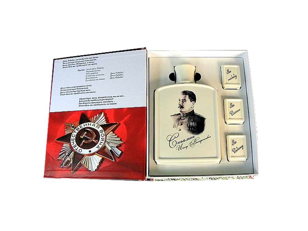 День Победы - один из самых важных и памятных государственных праздников в нашей стране. В этот знаковый для России день принято дарить памятные сувениры. Подарочный набор День Победы - это великолепный подарок на 9 мая, который запомнится надолго. Подарочный набор стилизован под книгу и состоит из штофа с изображением генералиссимуса И. В. Сталина и трех рюмок с патриотическими тостами За Россию, За Родину”, За победу”. Все сувениры выполнены из высококачественной керамики, поэтому они еще долго будут служить и радовать глаз. Этот подарочный набор станет прекрасным дополнением к праздничному столу. Внимание! Данное изделие относится к категории повышенной хрупкости. Для обеспечения его целостности и безопасной транспортировки настоятельно рекомендуется использование обрешетки. Обрешеточная упаковка является обязательной при доставке, и компания Oasis не несёт ответственности за повреждения, возникшие в результате ненадлежащей упаковки или транспортировки без обрешетки.