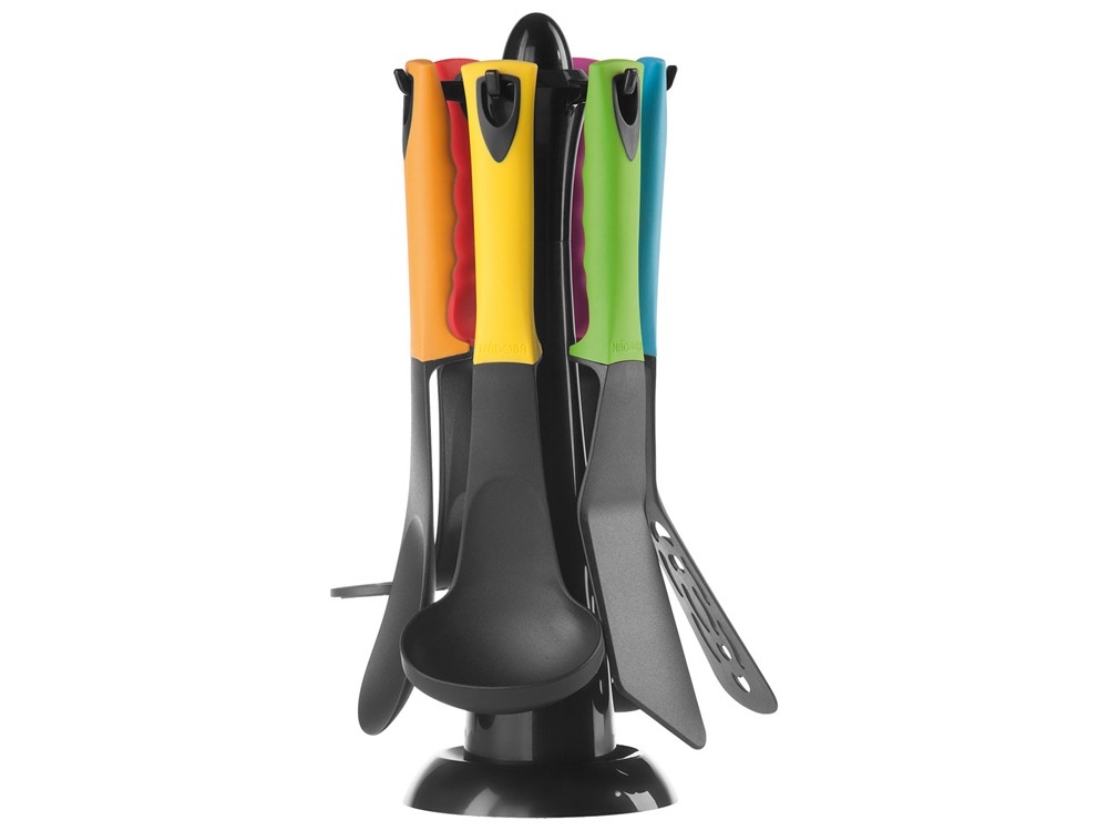 Инструменты серии Flava выполнены из высококачественного термостойкого нейлона, выдерживающего температуру 210°C. Все изделия абсолютно безопасны для любых антипригарных покрытий, обладают высокой прочностью и долговечны в использовании. Оригинальный дизайн инструментов предотвращает контакт их рабочей части со столешницей, сохраняя стол в чистоте. Эргономичная прорезиненная ручка не позволит инструментам выскальзывать из рук. Стенд набора инструментов вращается на своём основании, обеспечивая удобный доступ к ним. Гарантия на инструменты серии Flóra 5 лет. Комлектность: 1. Половник 2. Шумовка 3. Ложка кулинарная 4. Ложка кулинарная узкая 5. Ложка кулинарная перфорированная 6. Картофелемялка 7. Вращающийся стенд